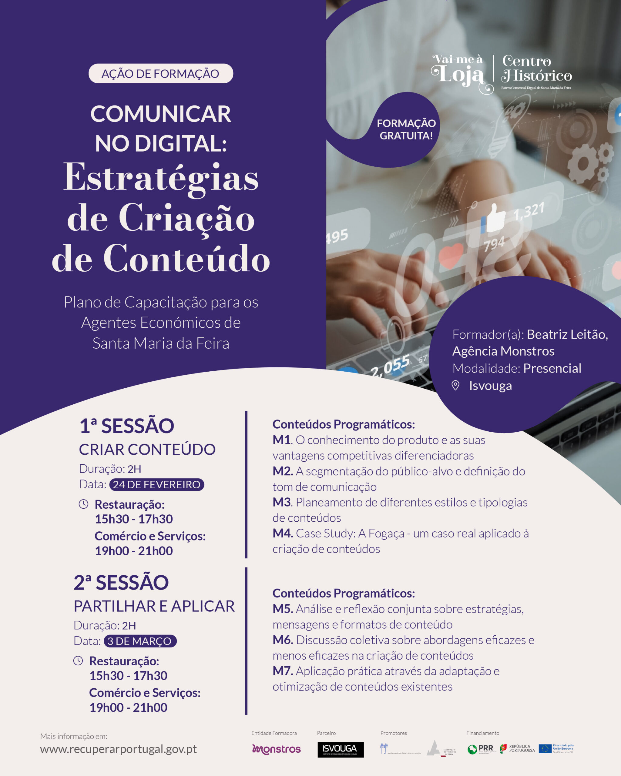 No âmbito do Plano de Capacitação para os Agentes Económicos de Santa Maria da Feira, foi criada a formação “Comunicar no Digital: Estratégias de Criação de Conteúdo”. Num mercado onde a atenção é o ativo mais valioso, não basta estar presente, é preciso ser-se relevante. A criação de conteúdo estratégico é hoje o motor que diferencia marcas e potencia negócios num contexto digital altamente competitivo.